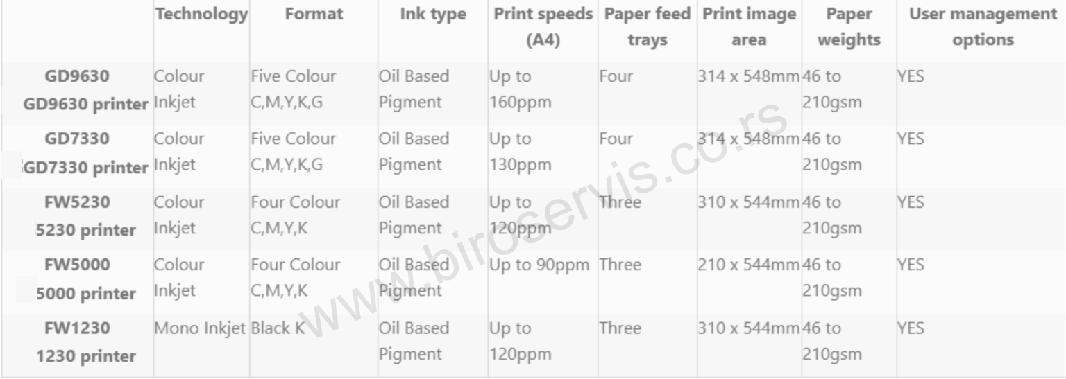 Rezolucija: 300×300, 300×600, 600×600 dpi (zavisi od podešavanja)                                                                           Brzina štampe 120ppm                                                        Velicina papira: 340x550mm                                        Gramatura papira: 46gsm do 210gsm